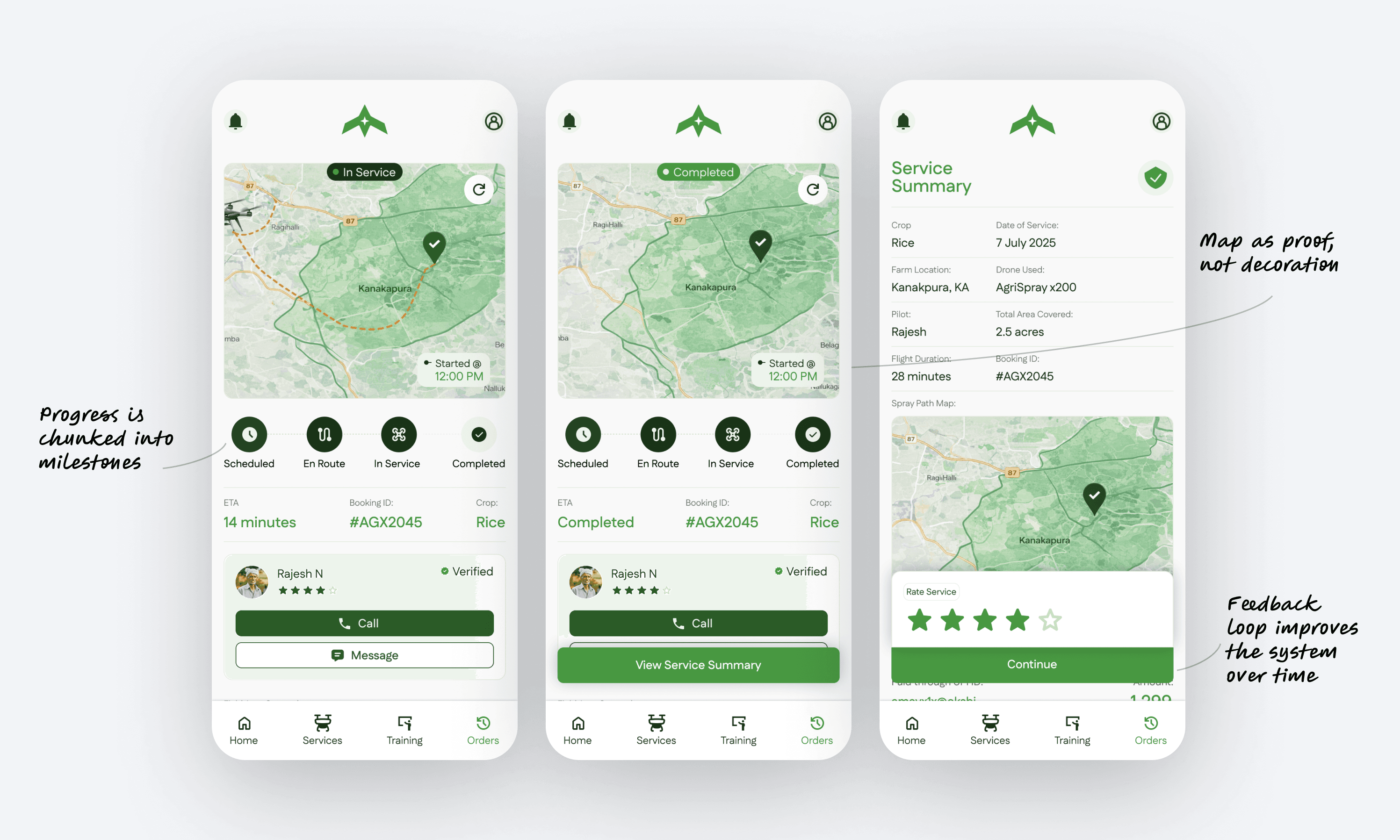 I designed the customer journey for drone-based farm services, from discovery to proof of completion.