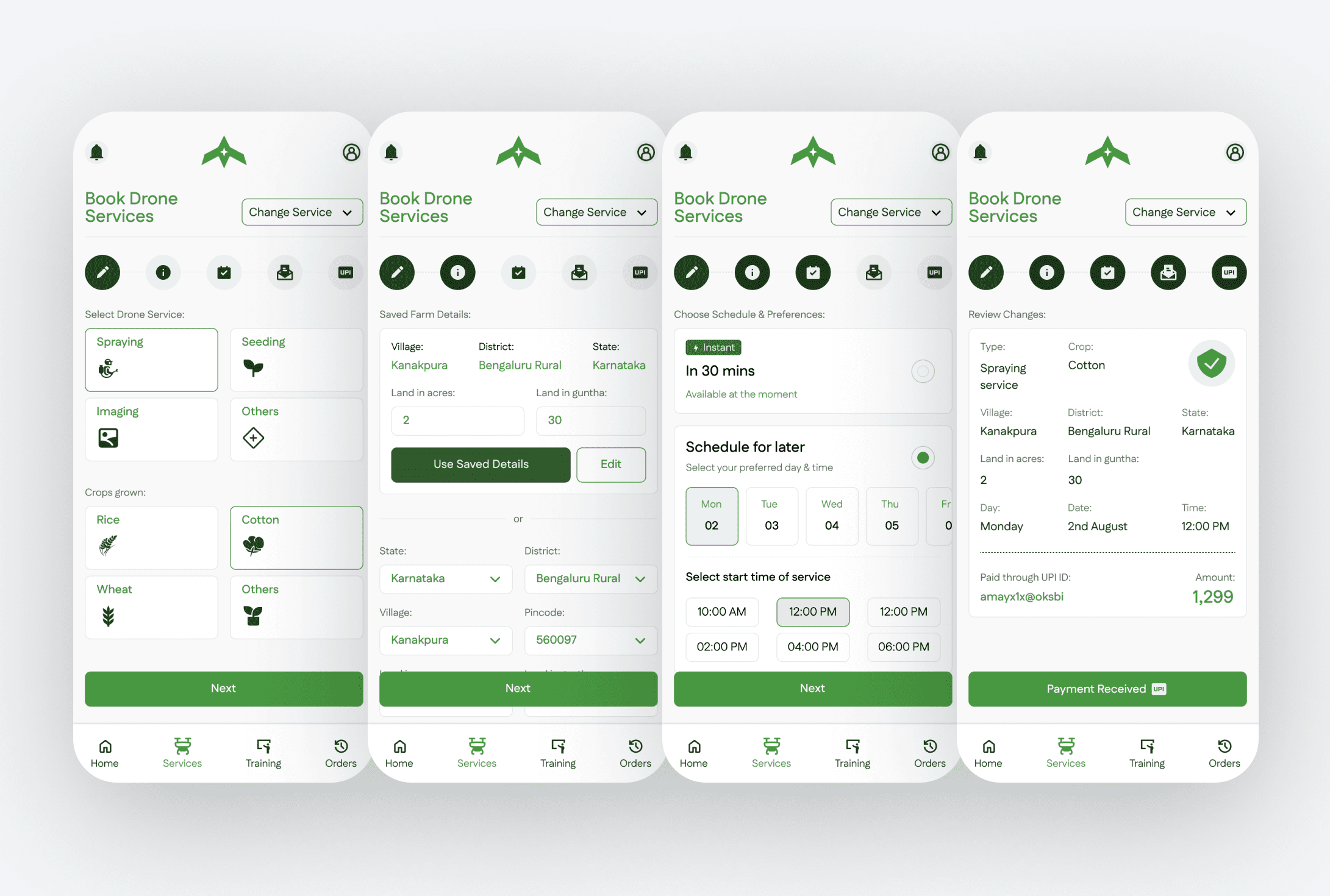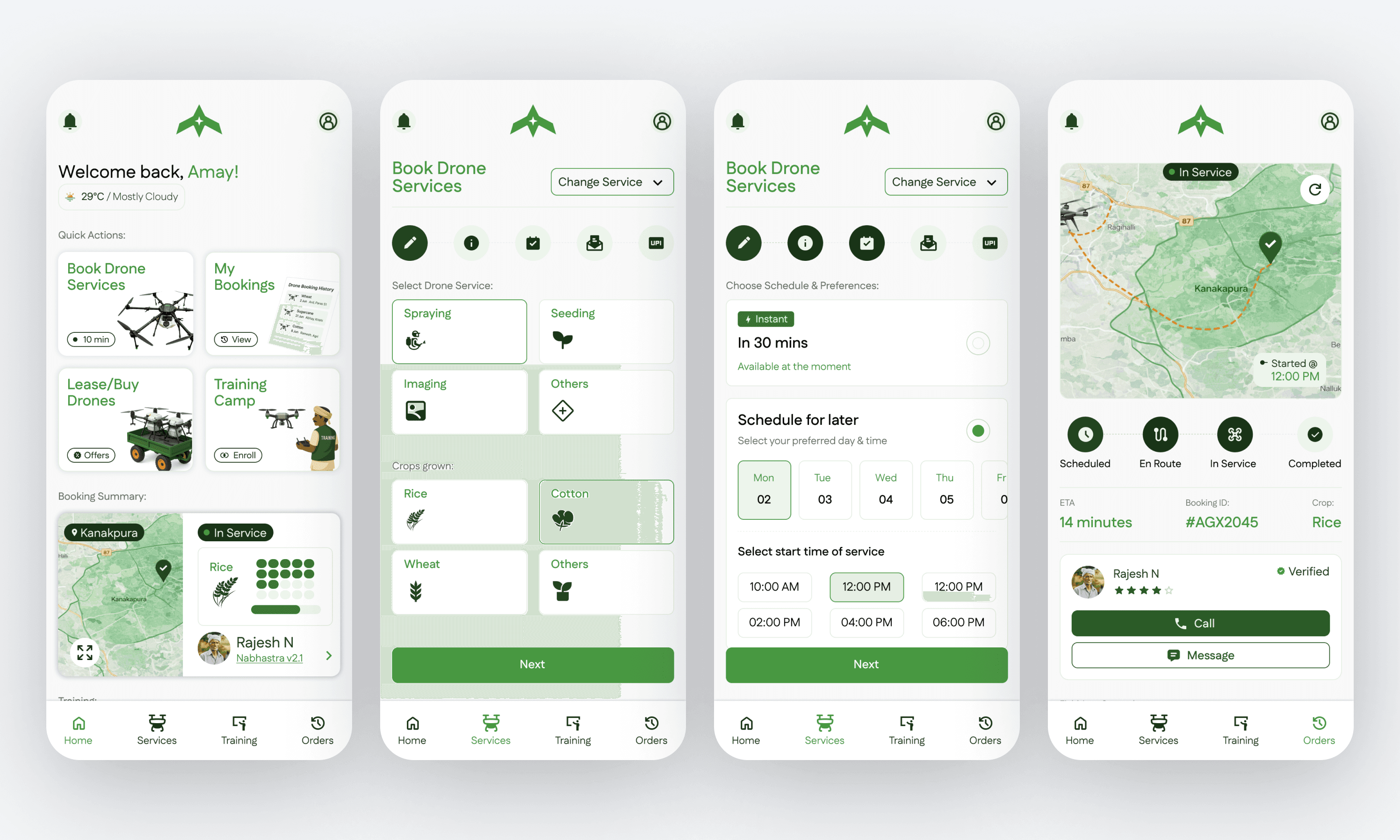 Nabhastra is a client project where I designed the end user booking experience for drone based farm services. The goal was to make a high trust service feel quick and obvious, while still respecting constraints like location, timing, and service completion.