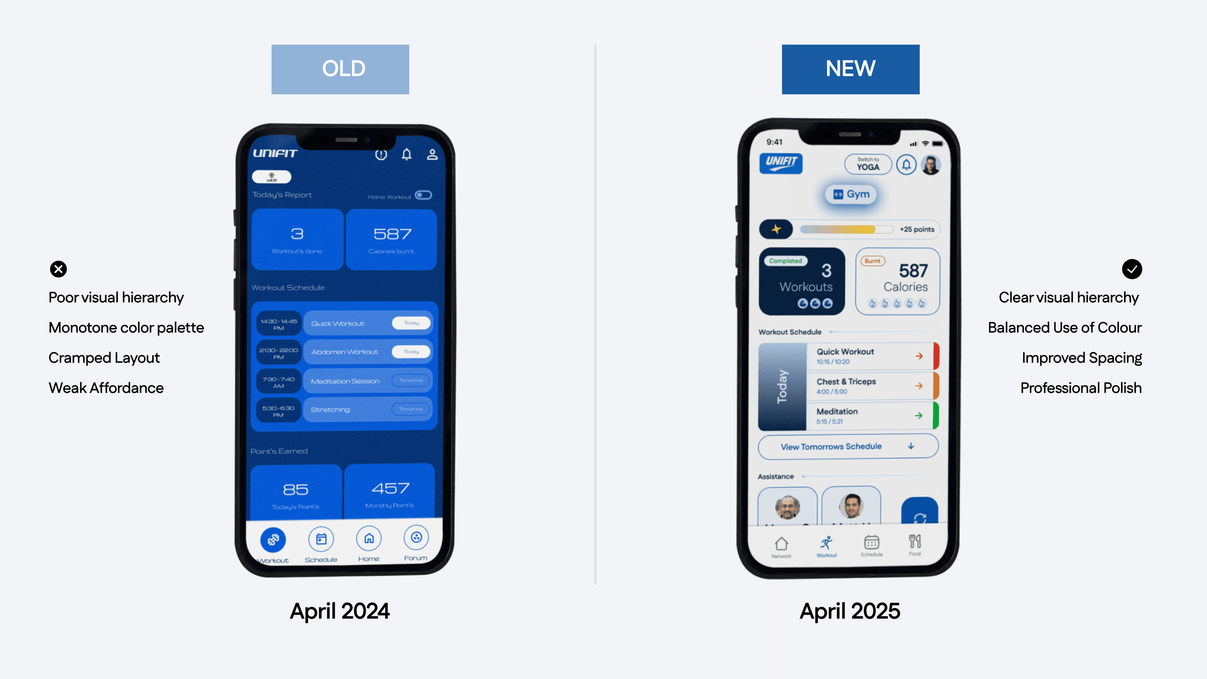 The April 2024 vs April 2025 comparison shows the gap between a working concept and a usable interface. The improvement came from details like spacing, hierarchy, and consistency, because that’s what decides whether people trust the system daily.
