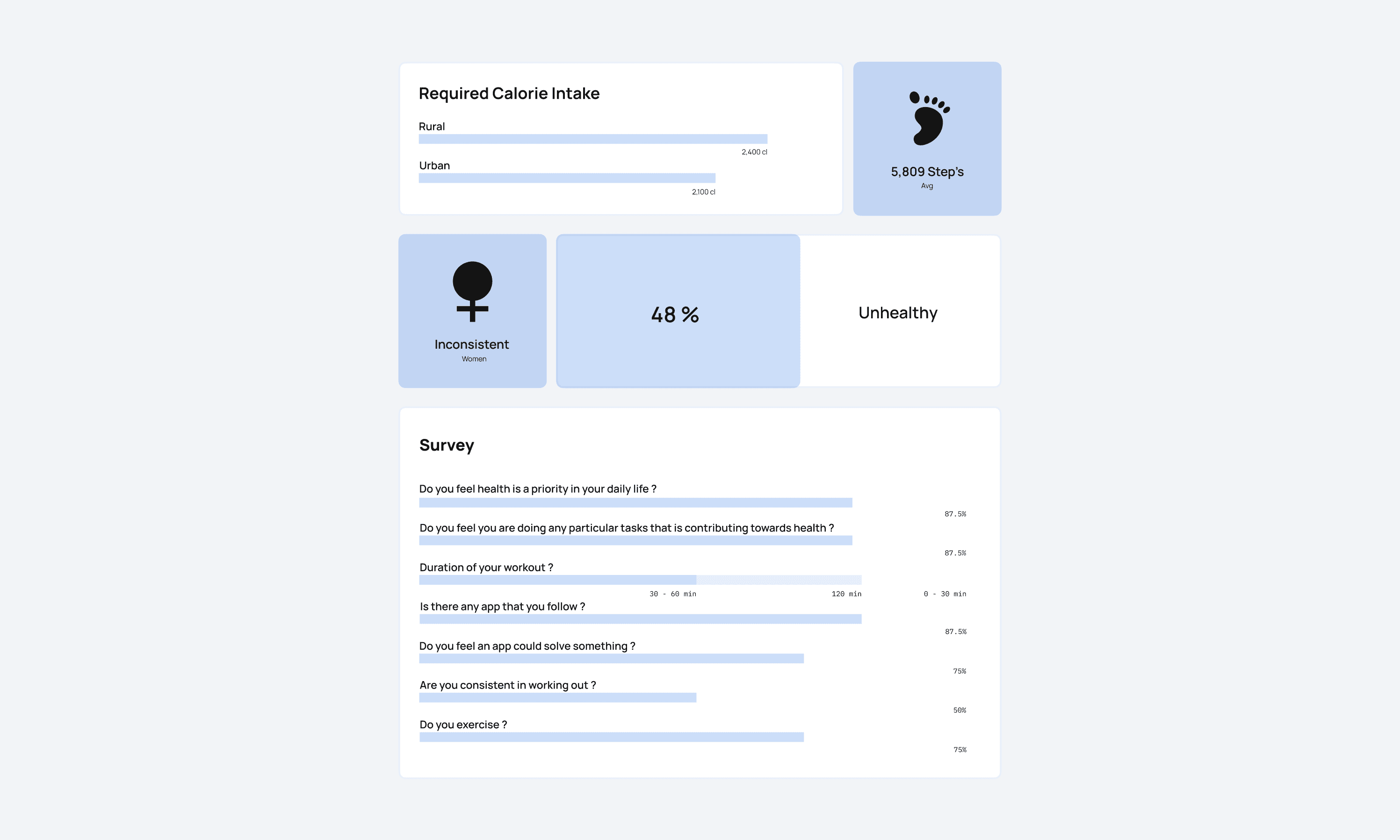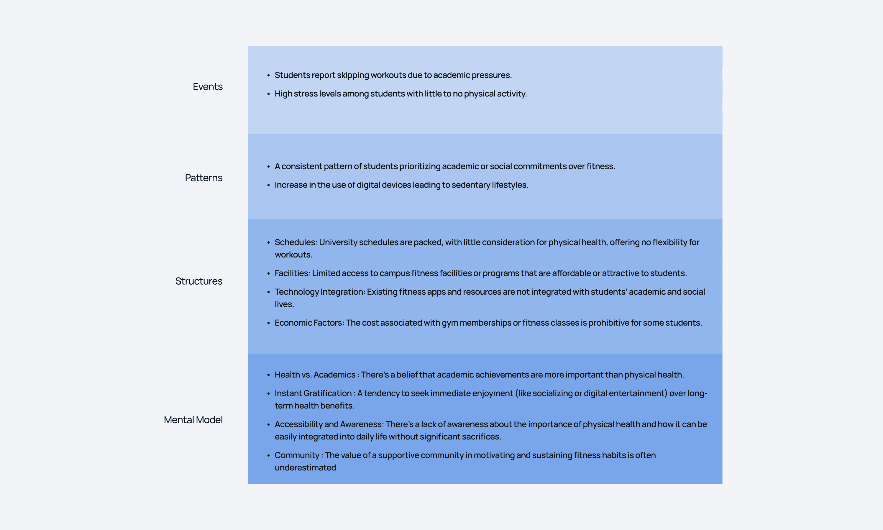 Captured broad patterns around student fitness habits, drop-offs, and what people actually prioritise day to day. Used it to spot themes worth going deeper into.