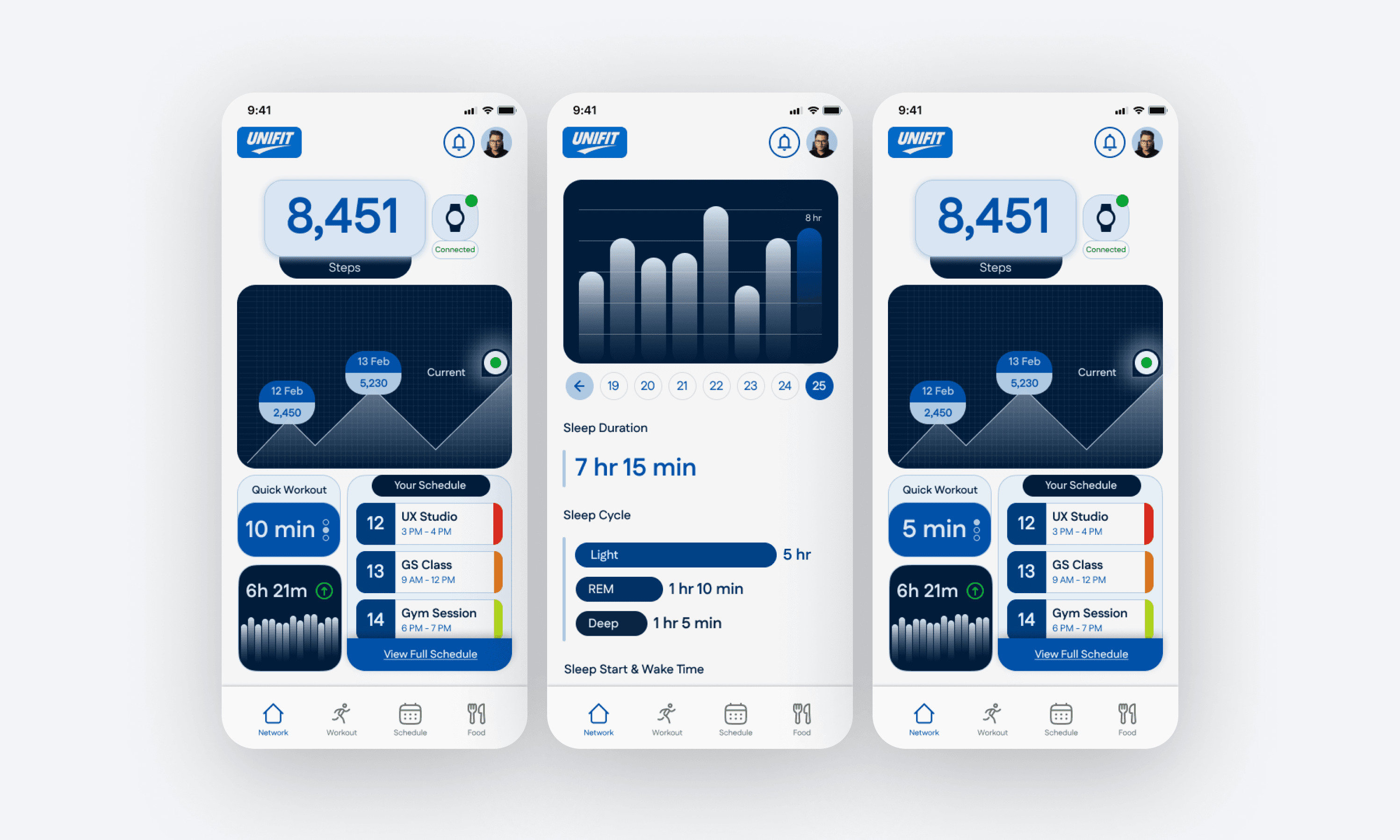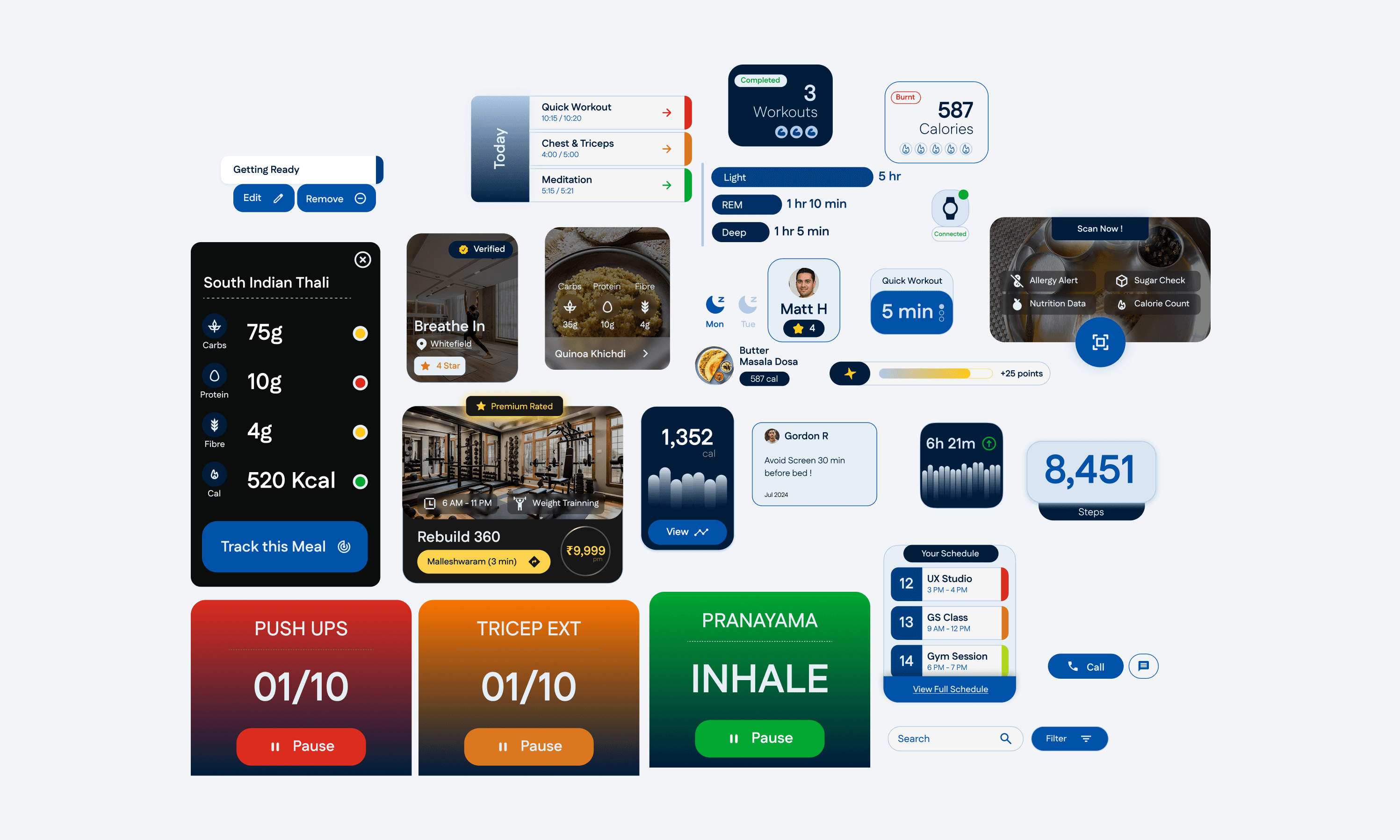 The home screens are built around the day’s routine: steps, sleep, quick workout, and today’s schedule sit together so users don’t have to jump tabs to plan action.