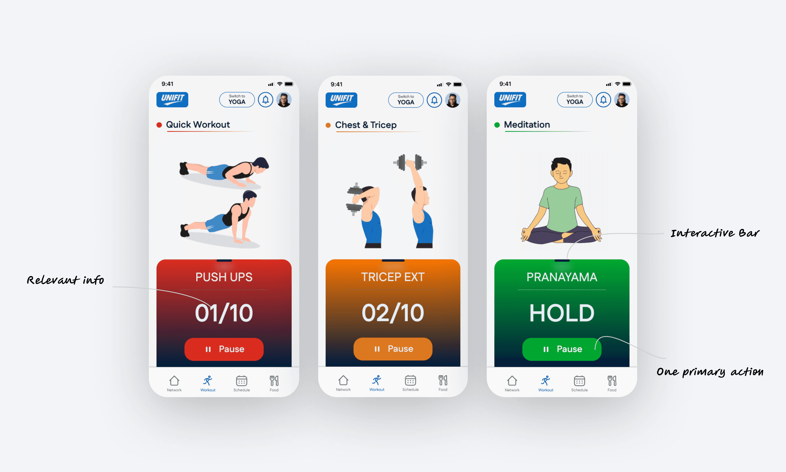 Quick workouts, timers, and one-tap actions are prioritised over exploration so users can act in the moment, even with low motivation or low time
